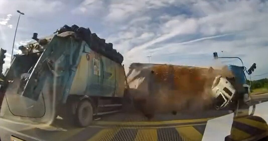 Dashcam footage revealed the moment when the traffic light turned green, signaling the movement of a garbage truck and several cars. Suddenly, the tipper lorry appeared from the left at high speed, crashing into the vehicles and causing significant damage, including the front cabin section of the garbage truck being ripped off, along with mud and debris scattered on the road.