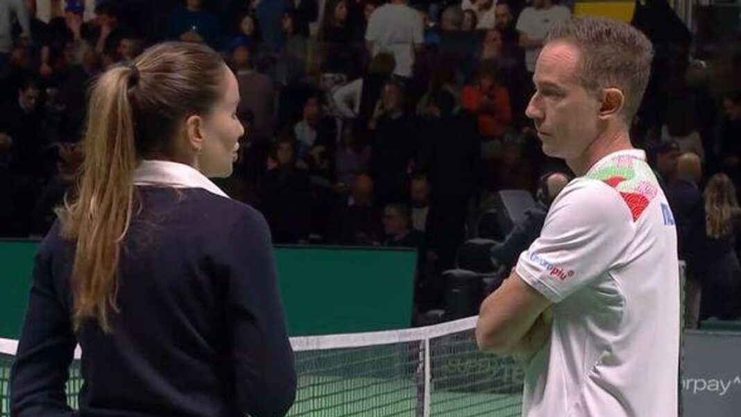 Meanwhile, during the break, umpire Marijana Veljovic interacted with the players, and Italian captain Filippo Volandri offered Cobolli words of advice.